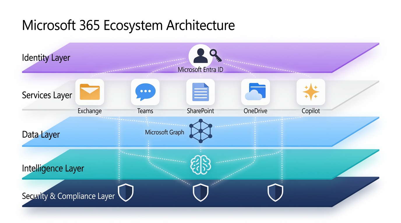 Microsoft 365 は、Exchange Online・Teams・SharePoint・OneDrive・Copilot という 5 つのコアサービスが、Microsoft Entra ID(認証)・Microsoft Graph(データ連携)・Microsoft Purview(コンプライアンス)によって一体として動く仕組みです。