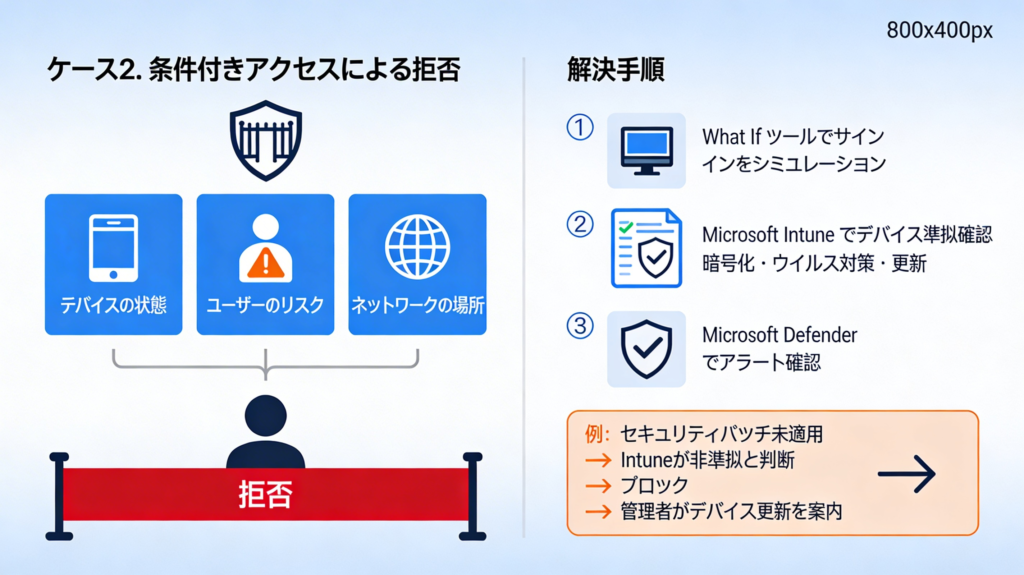 例:デバイスにセキュリティパッチが当たっていないためIntuneが非準拠と判断し、ブロックされることがあります。