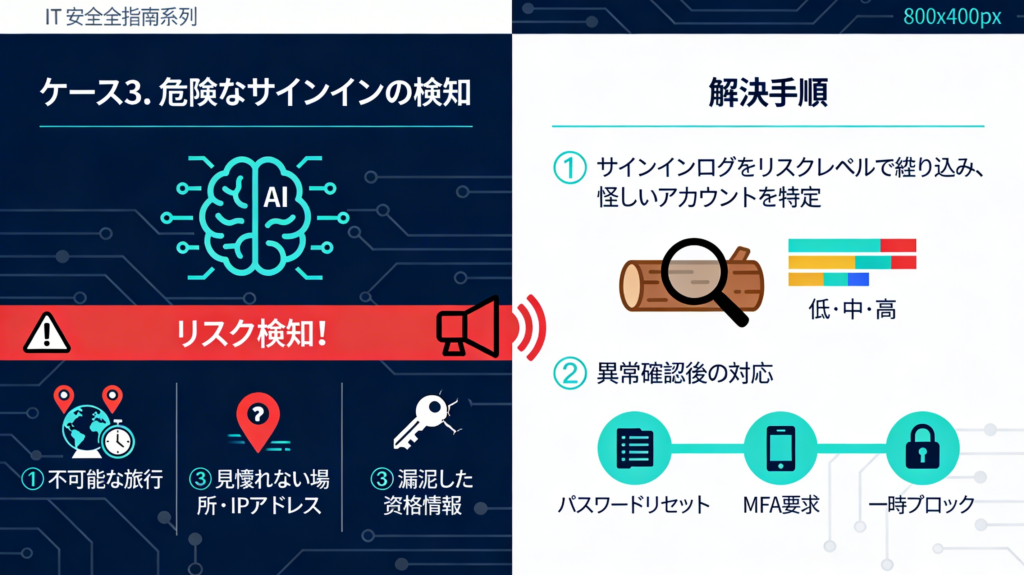 - 異常が確認されたら、パスワードのリセット、MFA要求、または一時ブロックを行う。