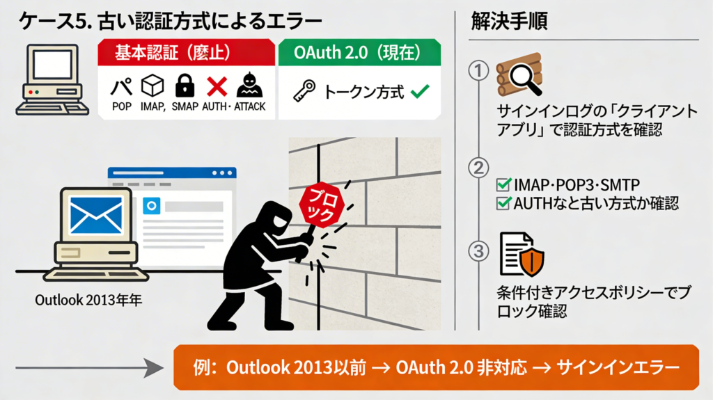 POP、IMAP、SMTP AUTHなど古い認証方式を使うアプリや古いクライアントは、サインインエラーが発生します。