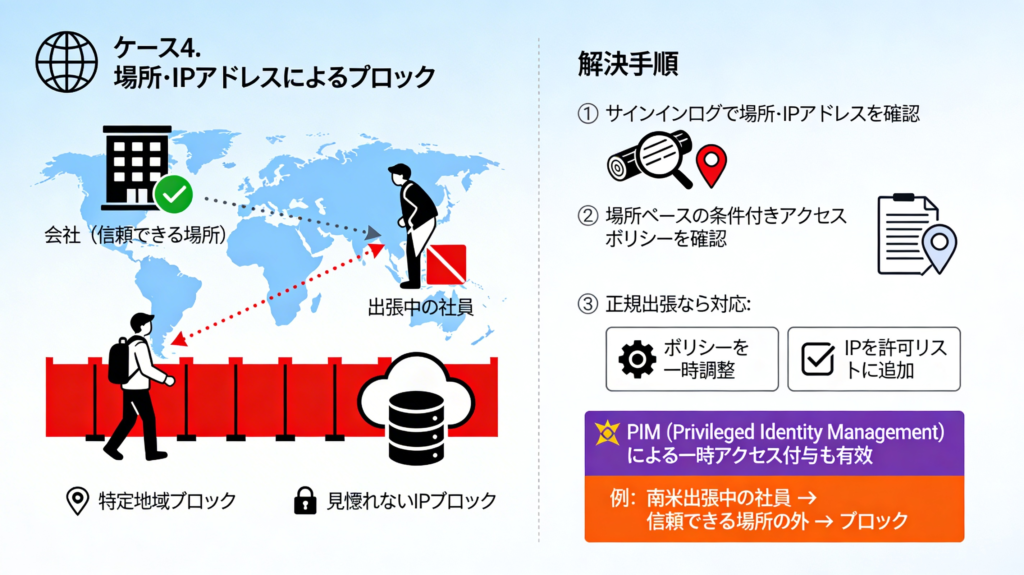 - ユーザーが正規の出張中であれば、ポリシーを一時調整するか、IPアドレスを許可リストに追加する。