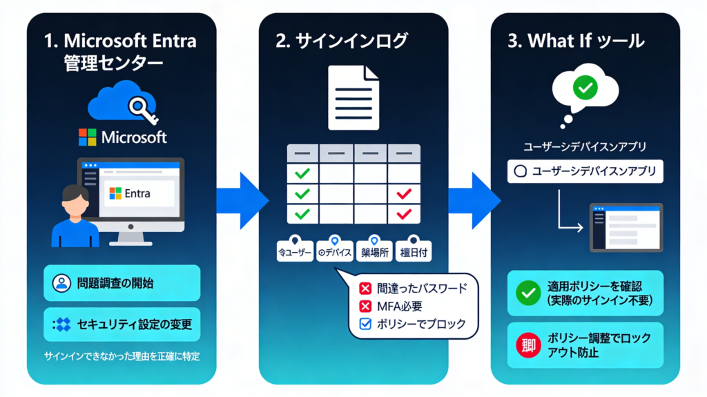- Microsoft Entra管理センター、サインインログ、What Ifツールを使い、MFA、条件付きアクセス、危険サインインなどの原因を素早く特定して解決する。
