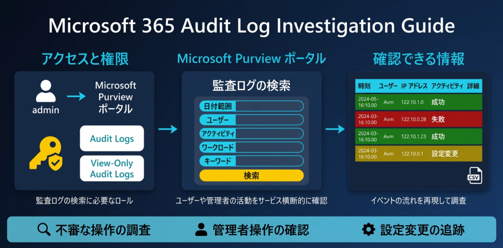 監査ログは、Microsoft 365テナント内で何が起きているかを把握するための記録です。