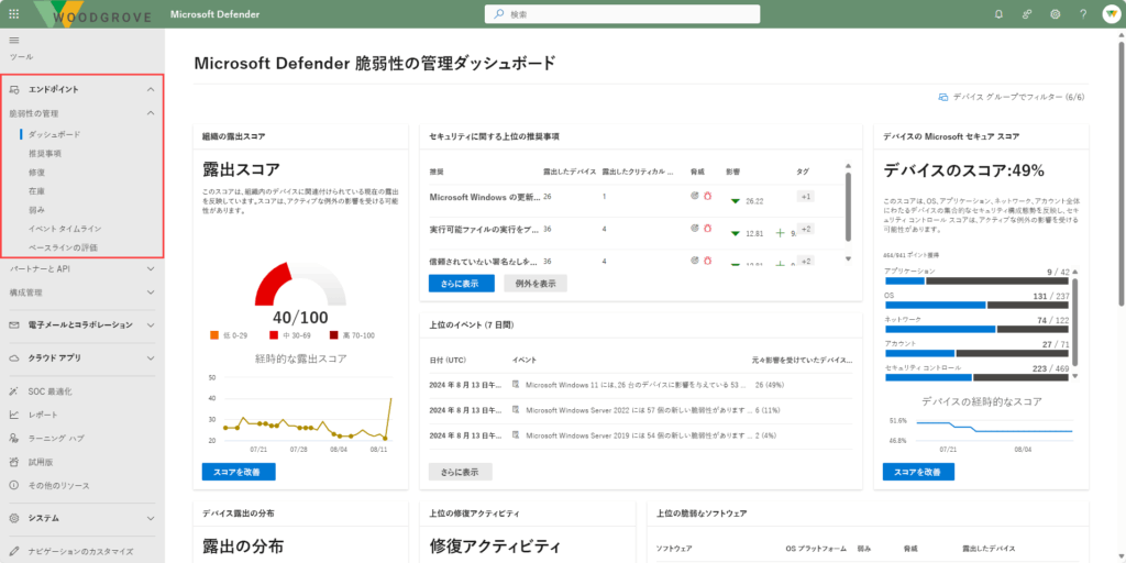 ダッシュボードでは、暴露スコアやセキュアスコア、主要な推奨事項、修復状況を確認できます。