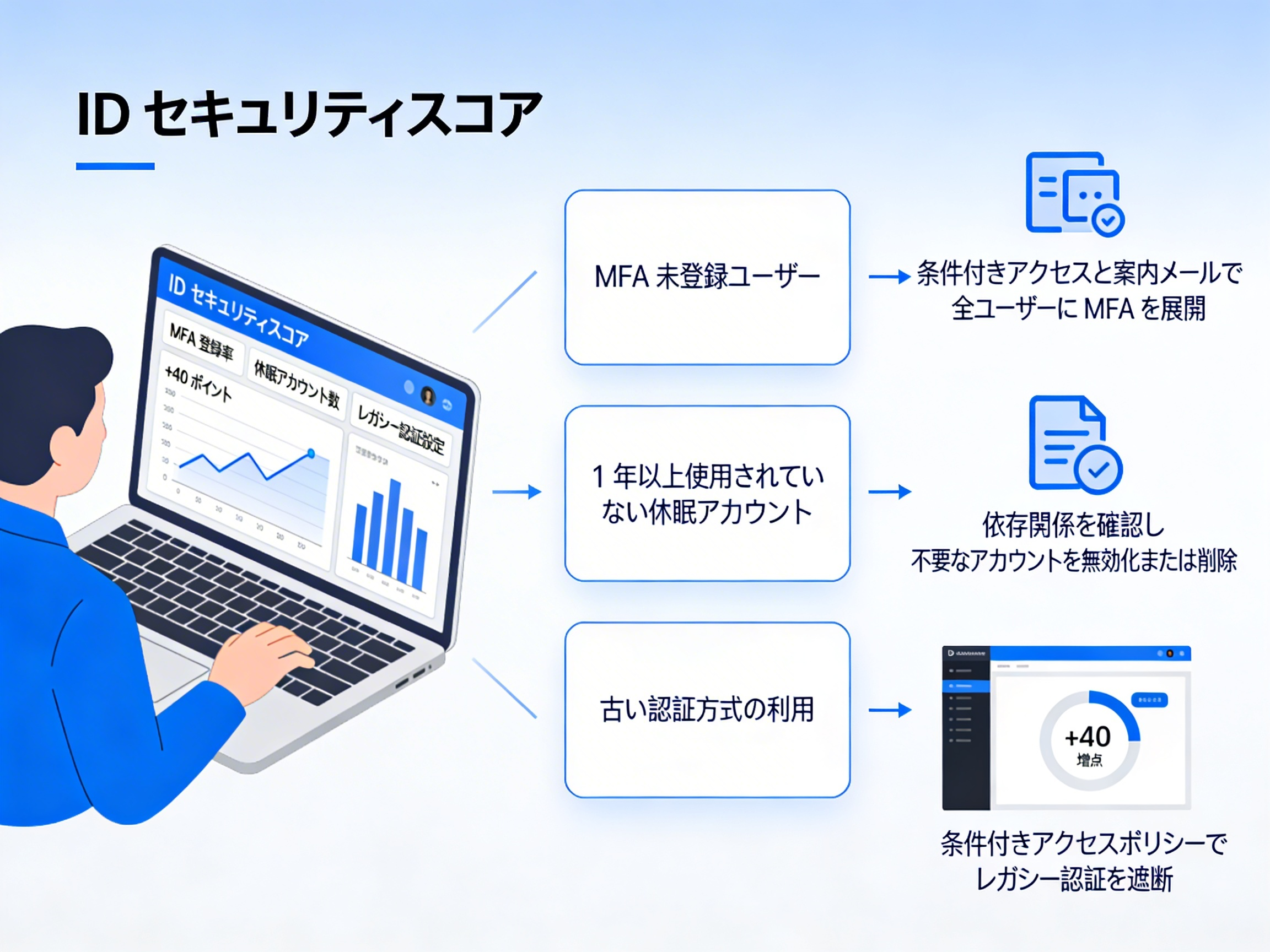 ある会社が ID セキュリティ スコアを確認したところ、次の課題が見つかりました。