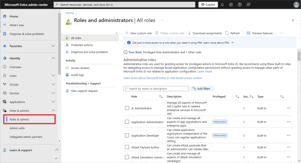 Microsoft Entra IDには、あらかじめ定義された組み込みロール(Built-in roles)と、柔軟に権限を設定できるカスタムロール(Custom roles)があります。